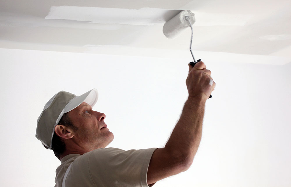 - Чтобы не остались непокрашенные места на потолке, следует отдельные участки перекрывать внахлест.