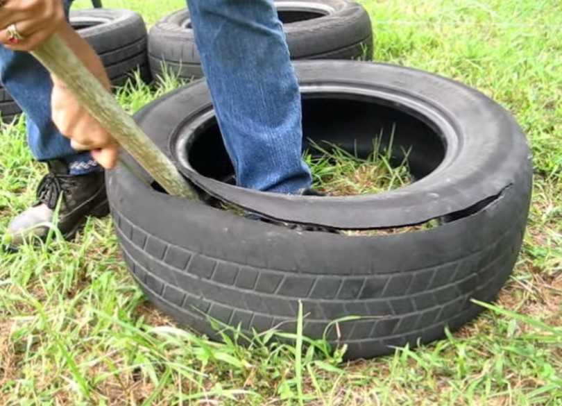 - Подготовить покрышки. Разрезать пополам, если это предусмотрено дизайнерским проектом.