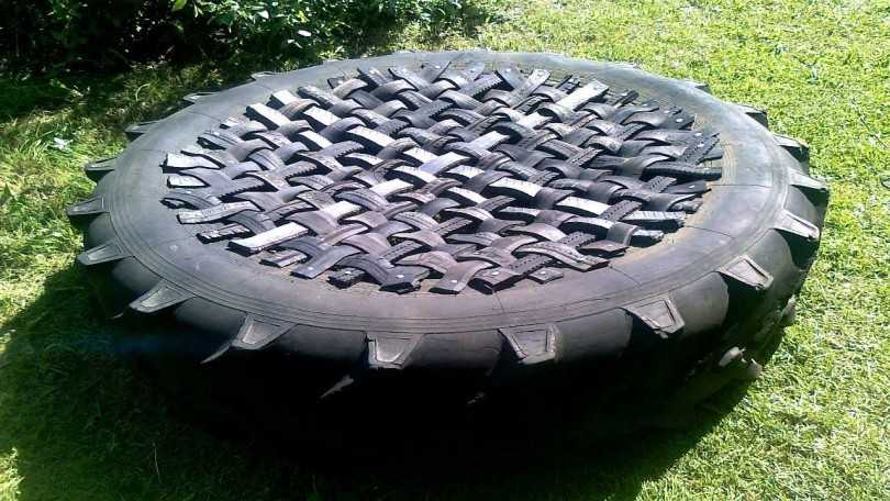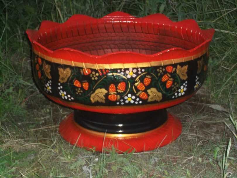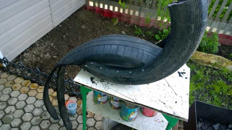 - Для этого внутренний край резинового колеса вырезается в форме зигзага или волнообразно, затем изделие выворачивают, шлифуют и покрывают нужной краской.