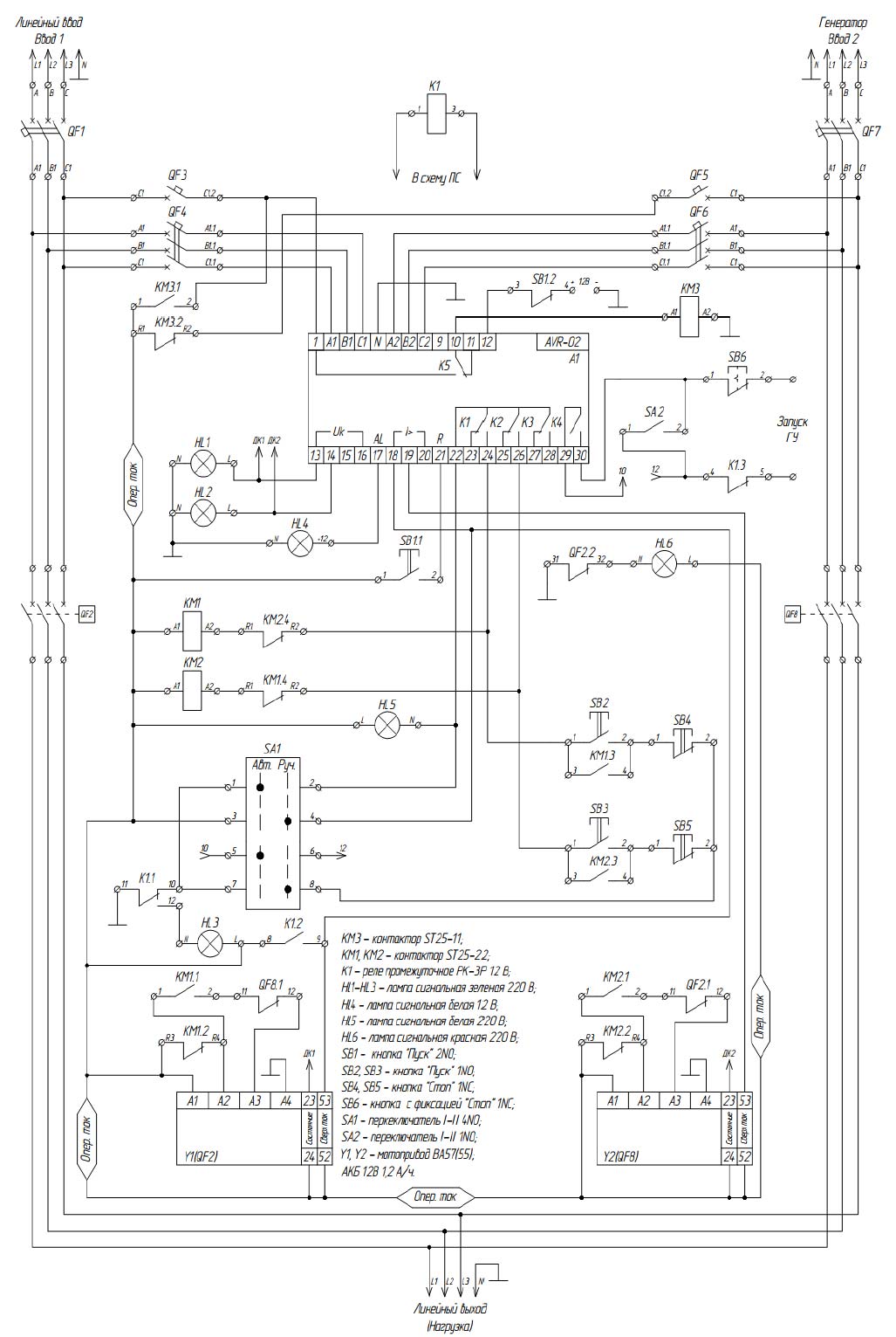 Также размыкаются контакты 22 и 24. Пускатель QF2 выключается. Спустя три секунды AVR 02 дает сигнал на запуск генератора. После его прогрева, происходит замыкание контактов 22-26. Подается напряжение на катушку КМ2 и включается пускатель QF8.