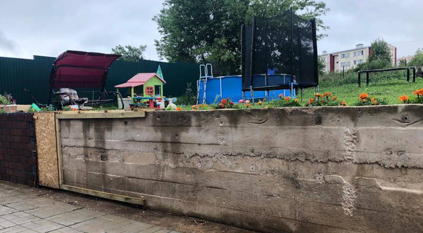 Это наша подпорная стенка, которую мы будем обшивать фасадной плиткой HAUBERK. Выглядит и вправду не очень…