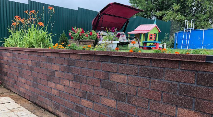 Стенка из кирпича делается, как и при обычном строительстве любого дома. Стена высотой до одного метра делается толщиной в половину кирпича, а выше — в целый кирпич. В дальнейшем стену облицовывают любым отделочным материалом для наружных работ.