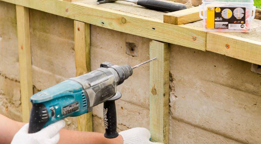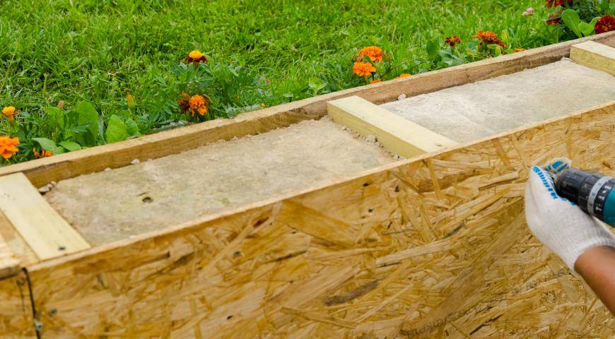 Затем из досок толщиной 25–45 мм делаем опалубку. Чтобы под давлением раствора не происходило выгибание досок, загоняем металлические прутья, с промежутком до 1,5 метра.