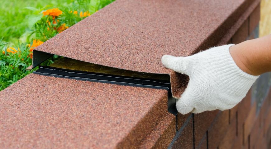 Верхнюю горизонтальную поверхность можно оформить несколькими способами. Например, покрыть её плитами натурального камня или керамогранита. Но можно создать стилистически единую поверхность со всей стеной с помощью фасонного элемента в цвет. Его можно заказать в любой мастерской по работе с металлом.
