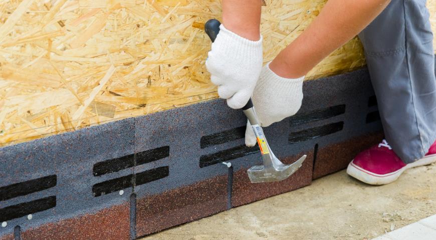 В начале крепится стартовая полоса. Она делается из стандартной плитки, у которой строительным ножом отрезаются «лепестки». Далее плитка прибивается к основанию на 11 оцинкованных гвоздей: по три гвоздя сверху и восемь снизу.