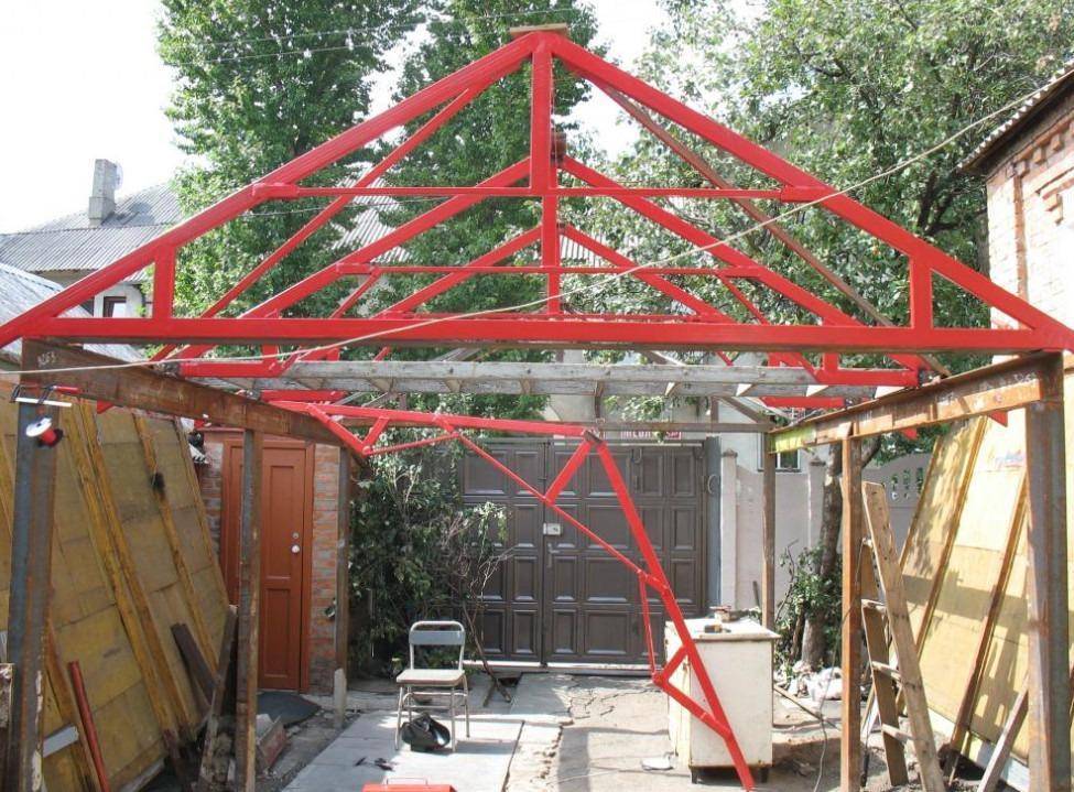 К верхнему краю столбов крепятся стропильные ноги, но в обязательном порядке под их середину устанавливают еще по одному столбу. После окончания монтажа кровельного материала необходимо лицевую часть кровли закрыть любым отделочным материалом. Обычно это все тот же профнастил или доска.