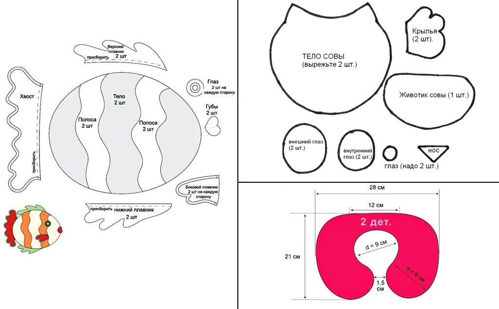 Слева – подушка-рыбка. Форма и техника исполнения выбраны вроде правильно: уходу вполне подлежит, последний шов можно прикрыть хвостом или плавниками. Но – голова спящего может сползти набок, за ней потянется плечо и окажется, что спим скрючившись. От этого недостатка свободна подушка-сова, справа вверху: «ушки» придержат. Кто сильно ворочается во сне, тому лучше класть такую подушку прогибом между «ушами» к шее; эту выкройку несложно приспособить и для подушки-кота, только без хвоста. В том и другом варианте крой для лучшей эргономичности в качестве спальной принадлежности желательно делать диагональным, см. далее.