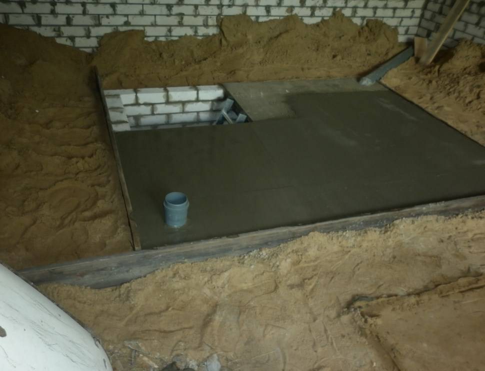 - на дне котлована делают песчаную подушку, кладут арматуру, заливают бетон;