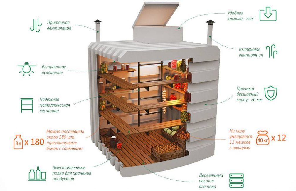 Промышленностью выпускаются готовые герметичные конструкции для погребов из самых разных материалов: от пластика до металла. Использовать металлические емкости нежелательно – они плохо хранят тепло.