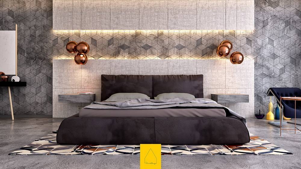 Разные оттенки одного цвета помогут зонировать пространство и создать игру теней. Например, часть спальни отделана светло-серым оттенком, а зона для сна глубоким насыщенным цветом.