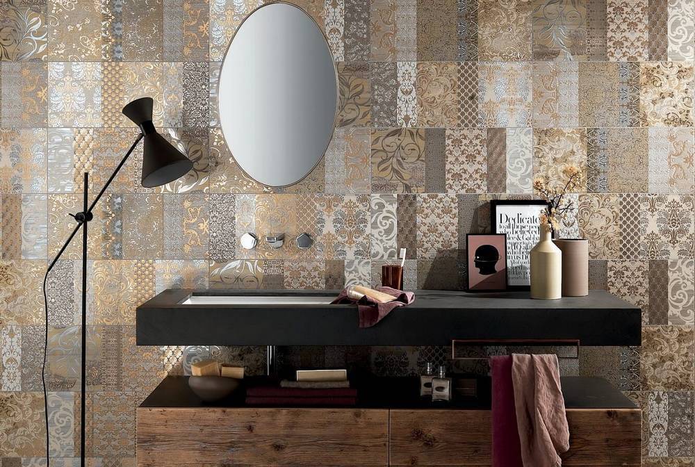 Один из самых распространенных способов отделки методом комбинирования. Цветочные узоры или орнамент может перекликаться со стилем интерьера. Узор наносится трафаретом, наклейкой или полотном обоев. Сегодня часто можно встретить в магазинах коллекции, в которых представлены однотонные варианты и с нанесением узора на ту же основу.