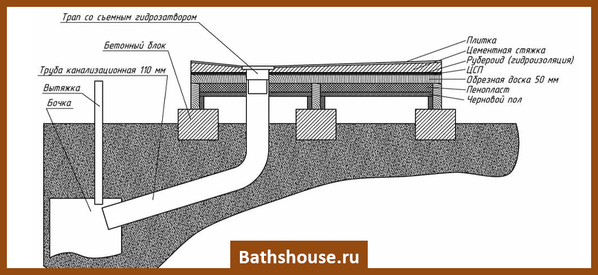 Слив воды в бане под пол допускается только в случае хорошей дренажной системы и нечастой эксплуатации бани. Самый простой вариант такой дренажной системы — большой котлован, заполненный щебнем.