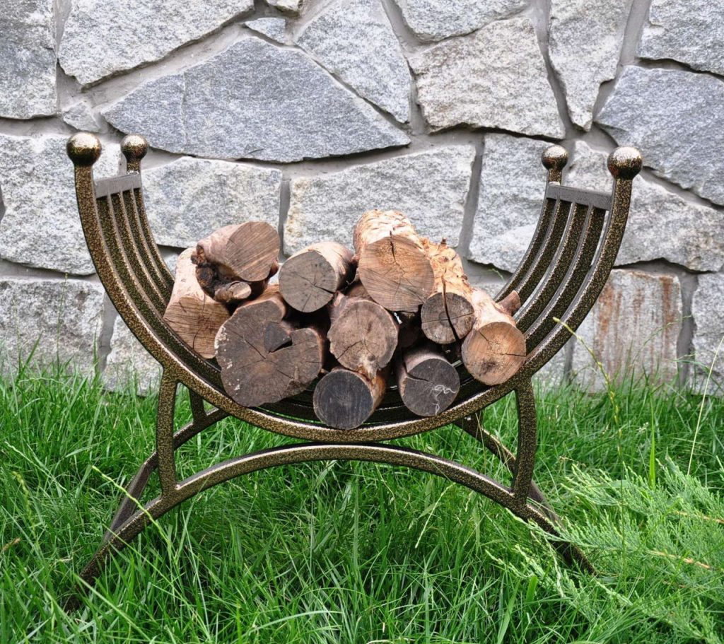 Более надежным будет стационарный дровник из стальной круглой или профильной трубы, швеллера. Каркас обшиваем стальной сварной сеткой. Металл покрываем грунт-эмалью или защитным слоем лака. У камина может быть декоративная подставка под поленья из кованых элементов.