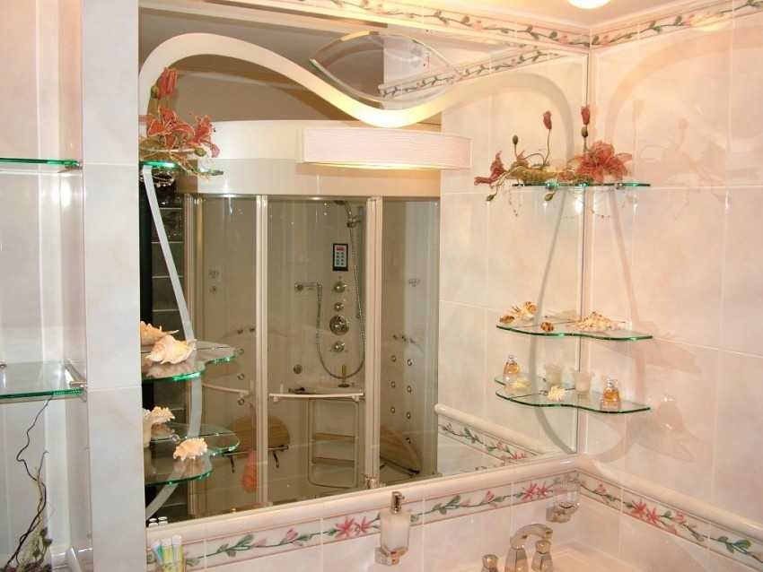 Обратите внимание! Стеклянная полочка под зеркало любого вида в ванную неширокая, но достаточно вместительная. Однако не следует перегружать ее большим количеством предметом