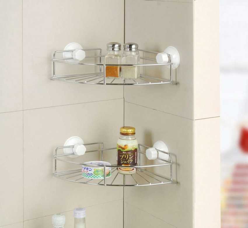 Угловые полочки помогут отлично сэкономить пространство комнаты. Некоторые модели идут с подсветкой из светодиодов, такие полки будут выгодно смотреться, и задавать некую изюминку любому интерьеру. Полочки могут крепиться как на саморезы, так и на присоски. Если вы будите располагать на полке легкие принадлежности, такие как стаканчик, со щетками, мочалки, зубную пасту – то стоит присмотреться к угловым полочкам на присосках. Если же место на полках будут занимать гели для душа, шампуни и прочее – то однозначно стоит выбрать крепление с саморезами.