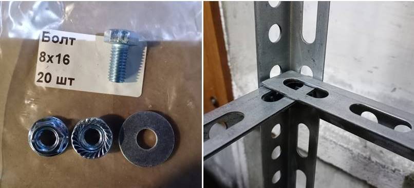 Болты, гайки и шайбы, я использовал такие. На одну полку уходит 8 гаек, 8 шайб, 8 болтов. При сборке, стык получается такой. короткий уголок снизу, длинный с верху.