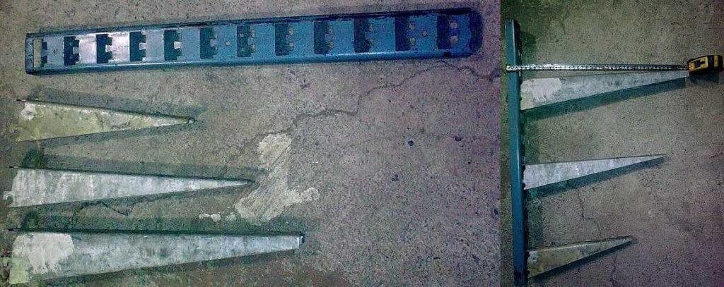 Изготовить металлическую конструкцию можно из прямоугольных труб или профтрубы с показателем ширины одной из сторон 5 см. Для изготовления поперечин используется 30-миллиметровыфй уголок. Каркас изготавливается из уголка с тем расчетом, что толщина полки будет составлять 1,5—3 см.