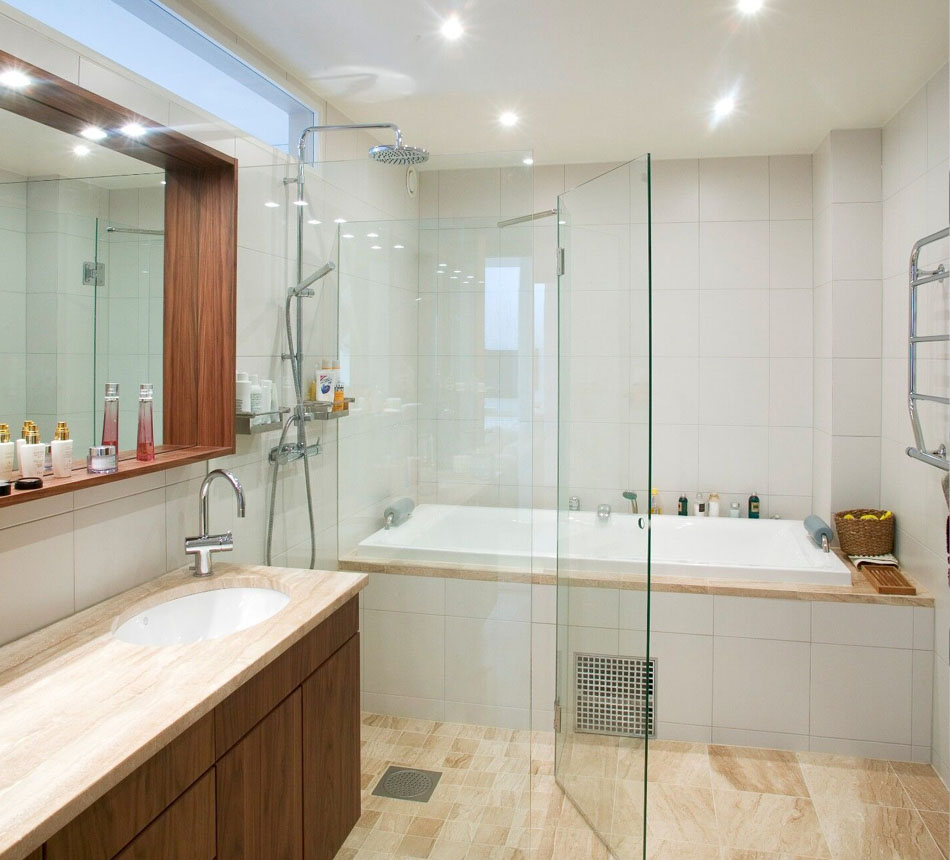 в «Хрущевке» Дизайн маленькой ванной комнаты основан на оттенках цветов, форм и фактур. Здесь нет места контрастам, зрительно разделяющим пространство, которое уже является спальней. Для стен и полов лучше использовать керамическую плитку и натяжной потолок, чтобы скрыть все его неровности.