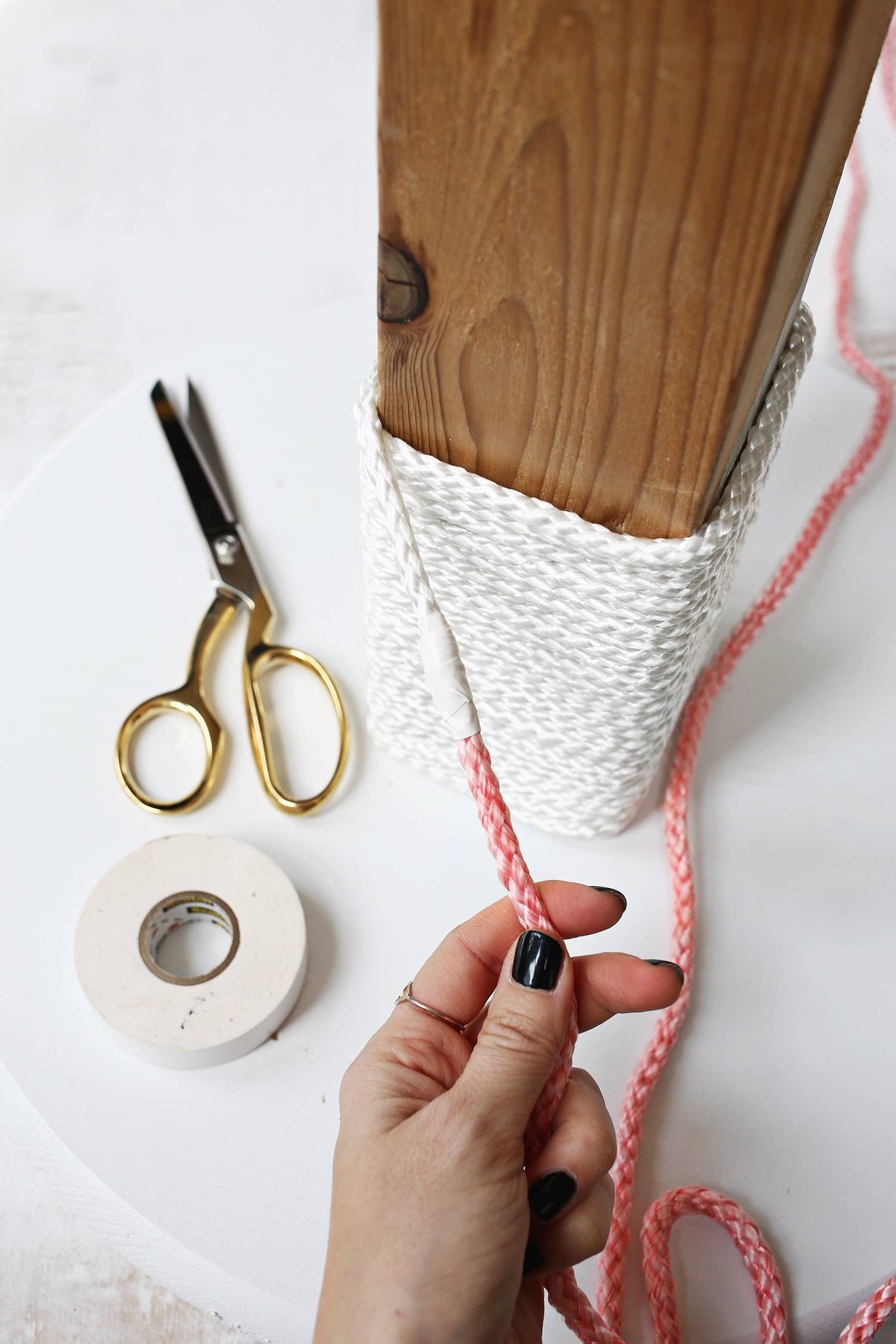 Просушите веревки и плотно оберните их вокруг ствола в определённой цветовой последовательности, закрепляя степлером.