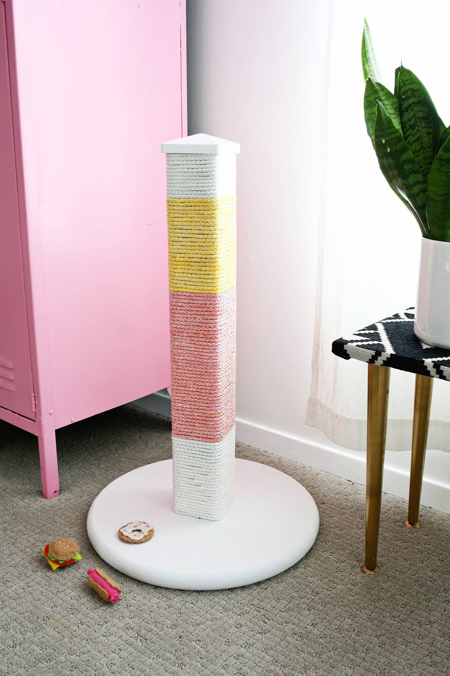 | Трубу крепят мебельными уголками, по три уголка на окружность. Столбик обматывают верёвкой и приклеивают её у основания и вершины. При желании основание и лежак декорируют с помощью ткани и мебельного степлера. Под ткань лежака потребуется синтепон или поролон. |