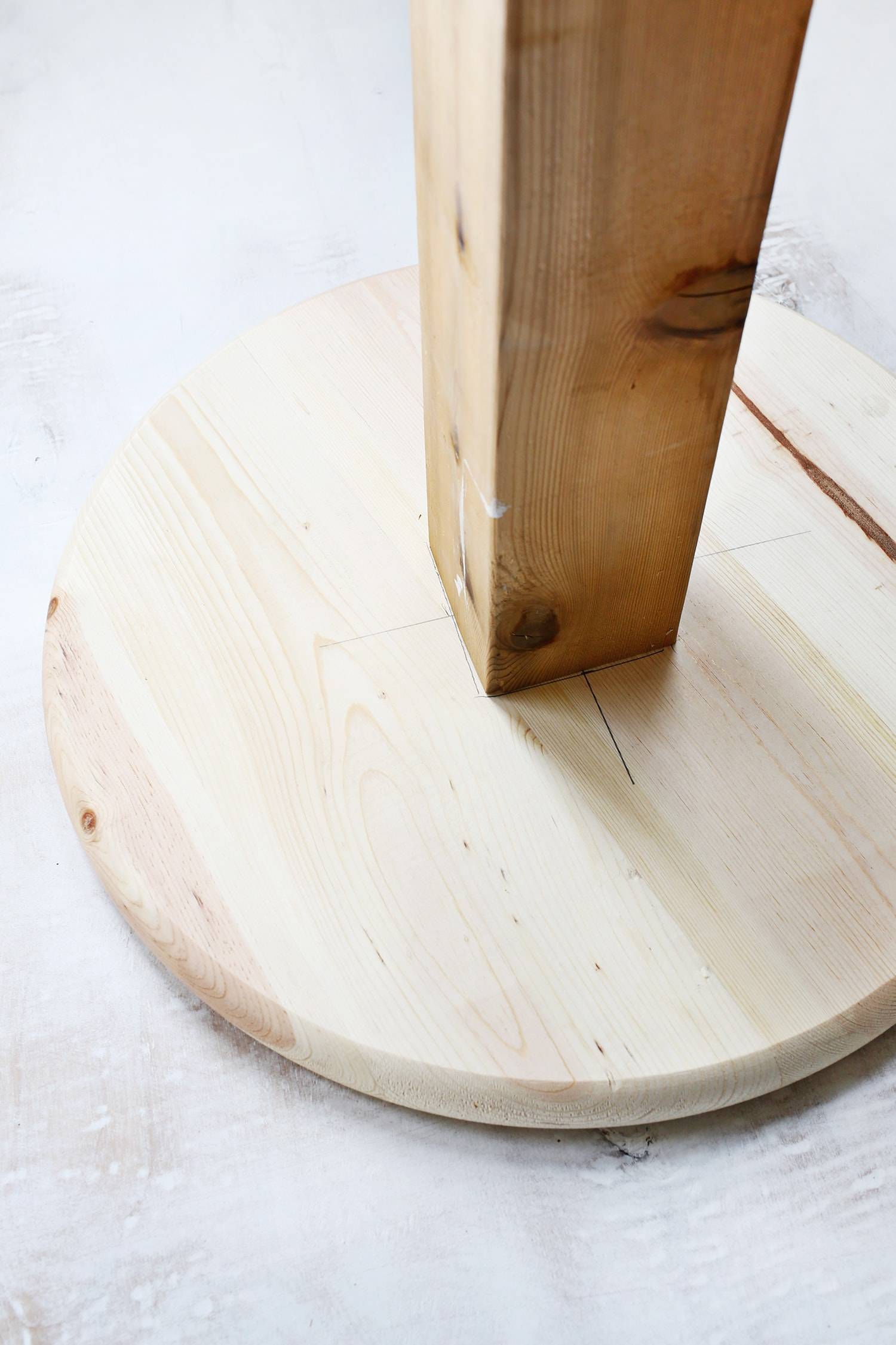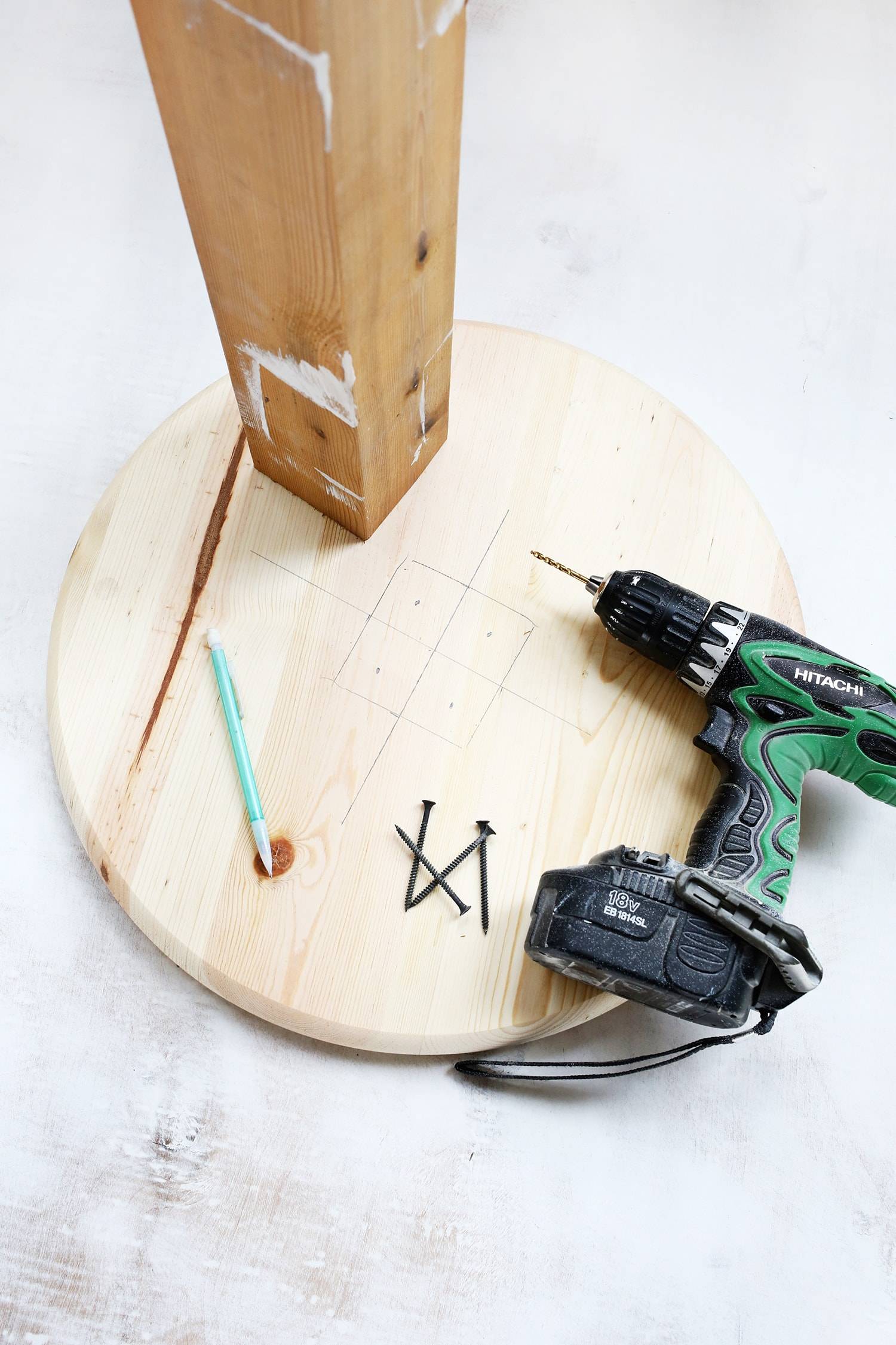 Делаем замеры, определяем центр для стойки. Начертите границы карандашом. Просверлите четыре отверстия для шурупов (возьмите сверло немного меньше самих шурупов).