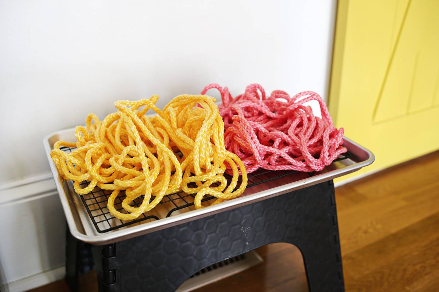 Хорошенько промойте веревку в прохладной воде от излишков краски. Аналогично проделайте с другими цветами.