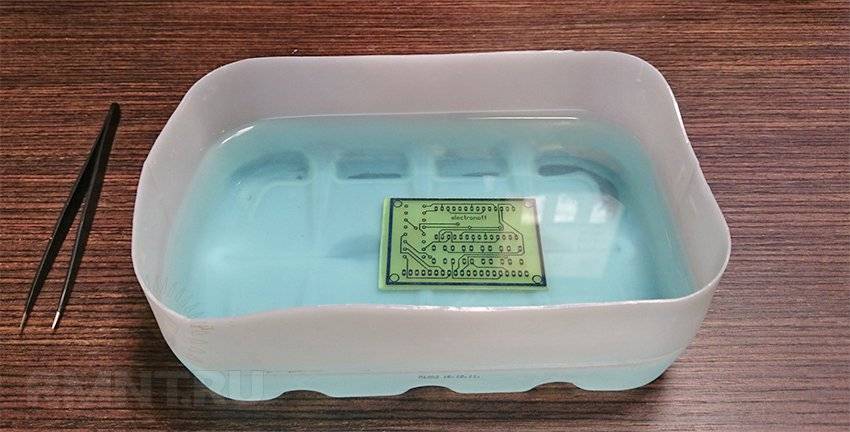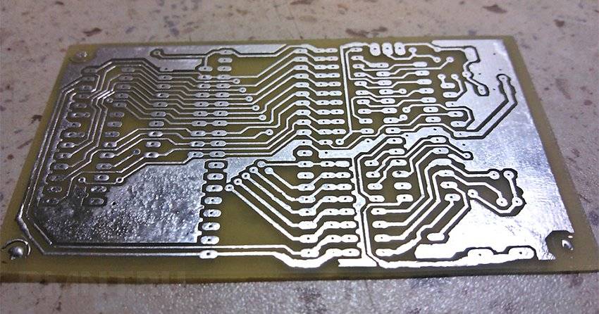 Вытравливать остатки меди можно хлорным железом, электролитом или даже поваренной солью, способов предостаточно. После вытравливания припекшийся тонер нужно смыть, просверлить монтажные отверстия сверлом в 1 мм и пройтись по всем дорожкам паяльником (под флюсом), чтобы залудить медь контактных площадок и улучшить проводимость каналов.