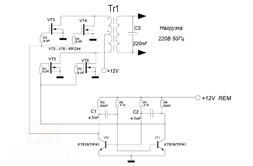 Первая часть схемы инвертора — входной мультивибратор, имитирующий колебания сети для совершения трансформации. Собирается он обычно на двух биполярных транзисторах, способных раскачать силовые ключи (например, IRFZ44, IRF1010NPBF или мощнее — IRF1404ZPBF), для которых важнейший параметр — предельно допустимый ток. Он может достигать нескольких сотен ампер, но в целом вам достаточно умножить значение тока на вольтаж аккумуляторной батареи, чтобы получить ориентировочное количество ватт выходной мощности без учёта потерь.