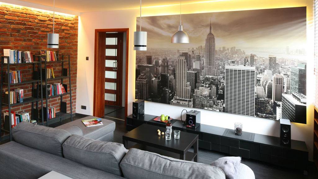 В современных стилях, таких лофт, хай-тек или урбанистический стиль, отлично будут смотреться панорамные полотна на стенах, которые, как бы, раздвигают границы пространства.Зачастую в зале используют изображения известных улиц или других мест.
