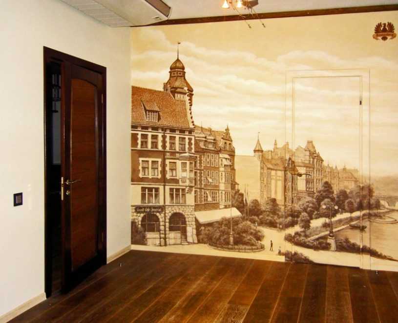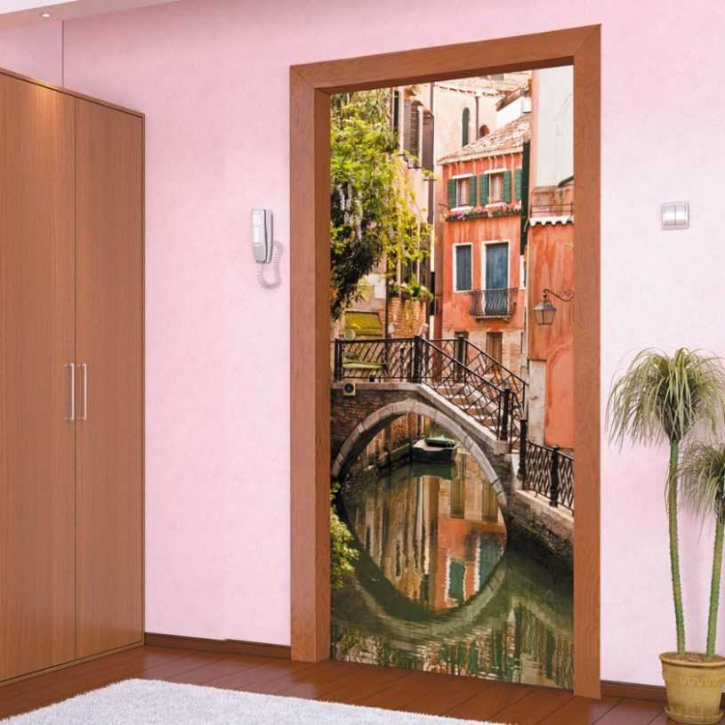 Не менее оригинальным решением является декорирование дверей фотообоями, которые в основном имеют клейкий слой, что обеспечивает простоту их использования. Материалом для изделий служит винил, бумага или флизелин, свойства которых описаны выше.