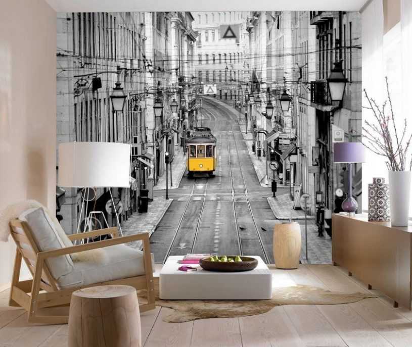 Изображения на обоях создают идеальное оформление для зоны отдыха, которое достаточно дополнить диваном и парой кресел. Если мебель яркая, обои должны быть приглушенными, выполненными в черно-белой гамме, так как привлекающий взгляд акцент в помещении уже есть.