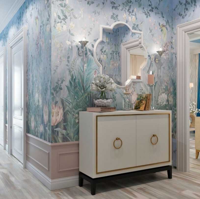 Такое изображение будет хорошо смотреться, если светильники, люстры, мебель и шторы в помещении выполнены в той же цветовой палитре, что и обои.
