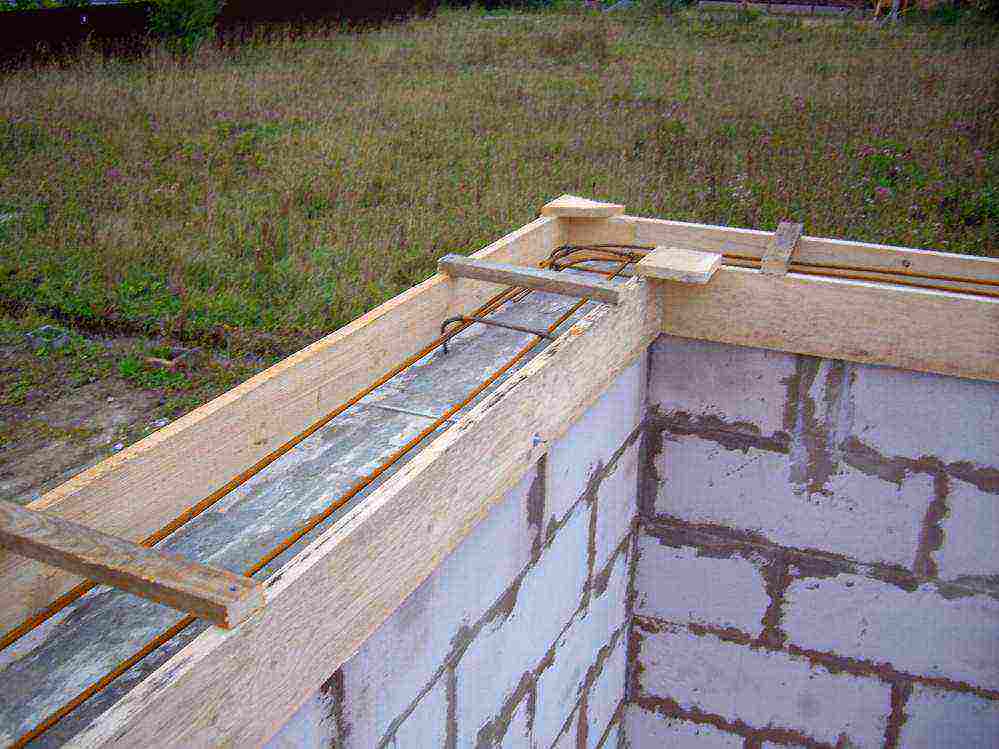 Как для любого строения из легкого бетона, для пеноблочной веранды необходим армопояс, он придаст жесткости всему строению и защит его стены от растрескивания и разрушения. Для его устройства понадобятся такие же материалы, как и для создания специфической перемычки. Технология заливки армопояса аналогична забивки все той же перемычки.