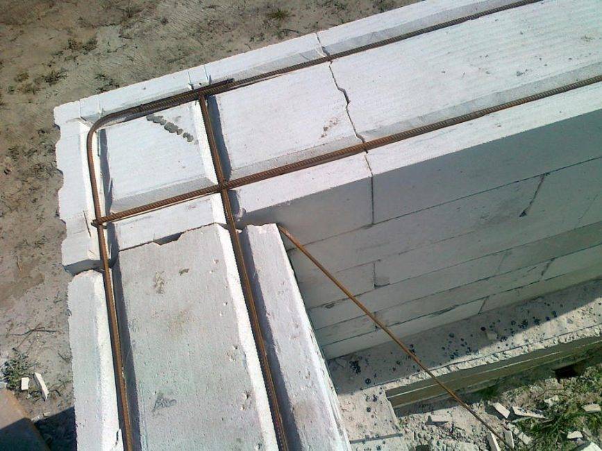 Для упрочения стены ее армируют вначале в первом, затем каждом четвертом ряду. Сделать перевязку требуется также над окнами и дверьми. Для этого с отступом от краев 3 см в блоках готовят штробы, в которые укладывается прутки. Учтите, что перевязка арматуры не должна приходиться на углы, места дверных и оконных проемов. Выемки заполняют клеевым раствором