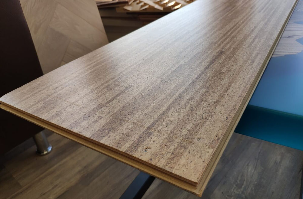 Клеевое пробковое покрытие — двухслойный материал. Снизу основание из прессованной технической пробки, сверху — тот же слой шпона. Нижний слой — 6-8 мм, верхний — около 2 мм. То есть, это покрытие гибкое и эластичное.