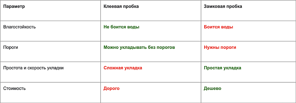 Как же выбрать, какой пробковый пол лучше, замковый или клеевой? Каждый неплох, но имеет свои нюансы. Для удобства выбора и более четкого представления, свойства покрытий сведены в таблицу.