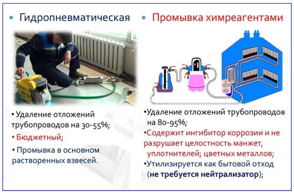 Метод очень похож на первый. Но для проведения работ используют более современные составы. В этом случае смесь для промывки действует только на загрязнения, не вступая в контакт с материалом труб.