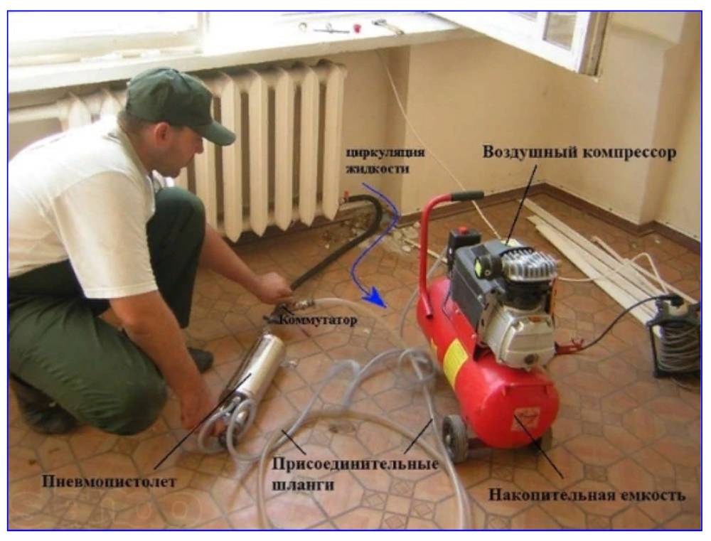 Специалисты, которые прибегают к данному методы очистки, обращаются к помощи специального оборудования для промывки отопления – водяному пневомпистолету.