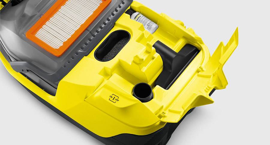 Пылесосы Керхер легко узнаваемы даже издалека: пластиковые детали корпуса окрашены в желтый цвет, остальные элементы – черные или темно-серые. Металлические детали – из нержавеющей стали