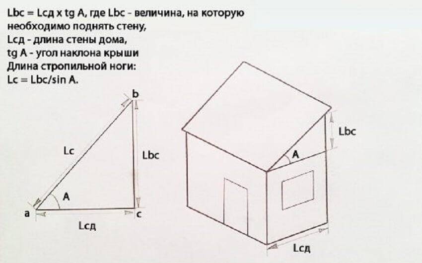 Геометрическая форма двускатной крыши — равнобедренный треугольник, поэтому для вычисления высоты конька в зависимости от наклона скатов, следует использовать формулу тригонометрического выражения для прямоугольного треугольника.
