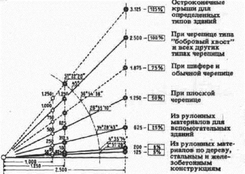 На графике они показаны дугообразными стрелками. Линии наклона показывают уклон ската. Выделенная (жирным) линия на графике обозначает отношение полной высоты данного конька h к половине его обычного заложения ½. Отношение 1/2 указывает, что вертикальный отрезок h располагается на горизонтальном отрезке ½ два раза. Наклонная линия на полукруглой шкале обозначает угол наклона в градусах, а шкала, расположенная вертикально, – уклон крыши в %.