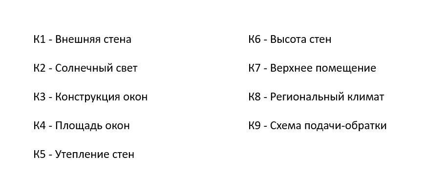 S х 100 х k1 х k2 х k3 х k4 х k5 х k6 * k7 = мощность радиатора, где K, это параметры теплопотерь: