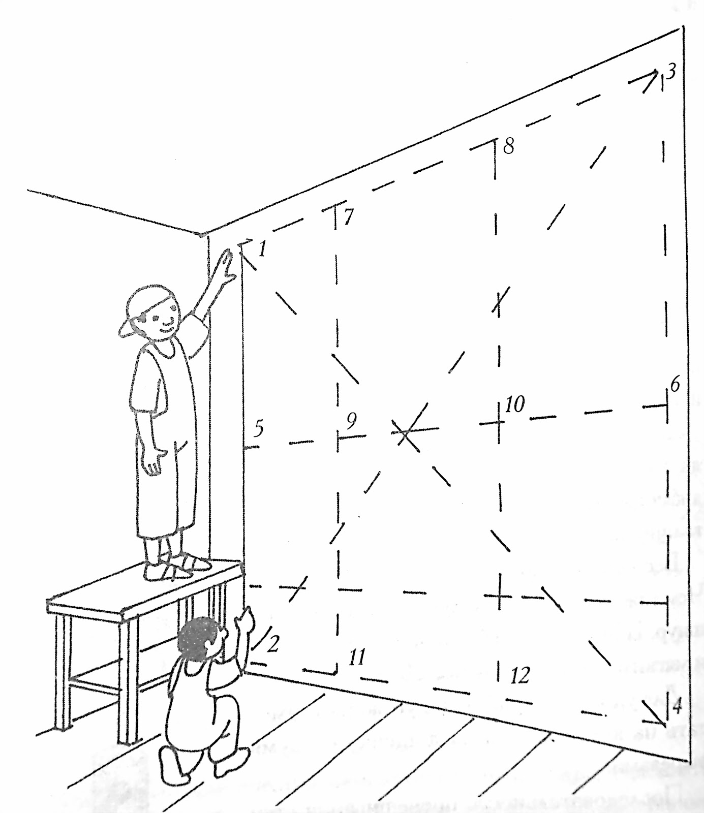 Провешивание выполняют по схеме, приведенной на рисунке, при этом необходимо обозначить вертикали и горизонтали, точность которых проверяется с помощью уровня и отвеса.