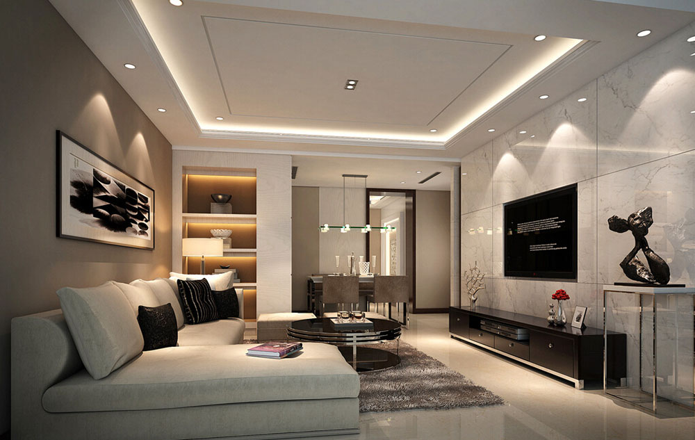 В зале для приёма гостей точечные светильники можно разместить совместно с люстрой либо без неё. Потолок здесь формируется нередко ярусный, освещение организуется разнообразное на несколько выключателей. Гостиную можно считать помещением, в котором реализуется самое большое количество идей.