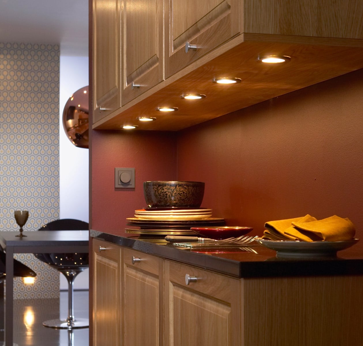 Если кухня большая, понадобится установка множества светильников. При необходимости точечные приборы можно дополнить другими источниками света (например, ЛЕД-панелями).