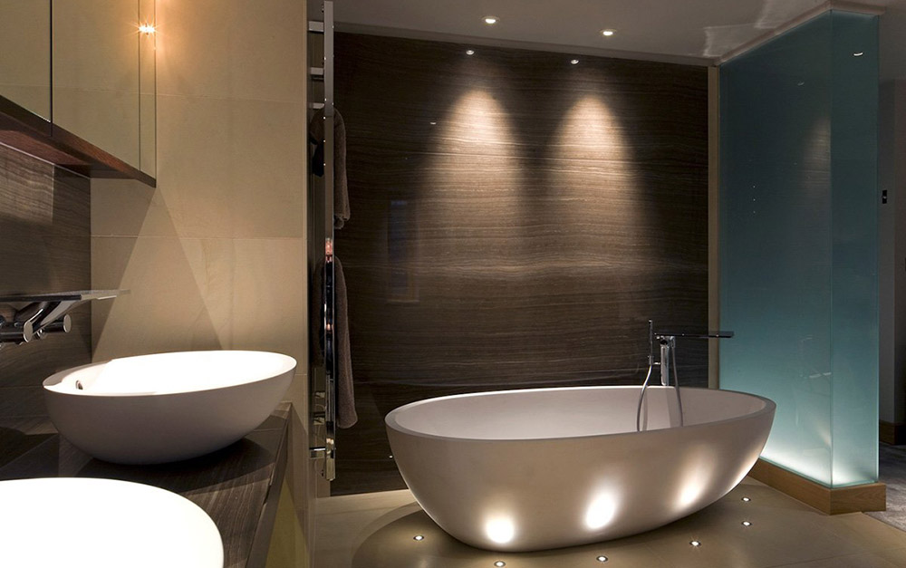 Ванная и туалет обычно представлены небольшими площадками со светоотражающей декоративной отделкой в светлых тонах. Последнее позволяет отказаться от ярких источников света, которые через глянцевую плитку бликуют в разных местах. Поэтому количество точек редко превышает 4-6 единиц. Располагаются они на натяжном потолке в углах, вдоль стен или симметрично в два ряда. Могут также присутствовать акценты на стенах, где вешаются зеркала, хранятся душевые принадлежности.