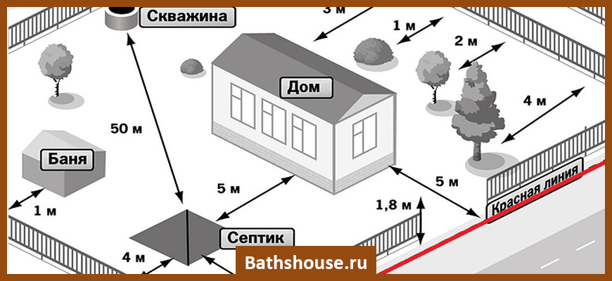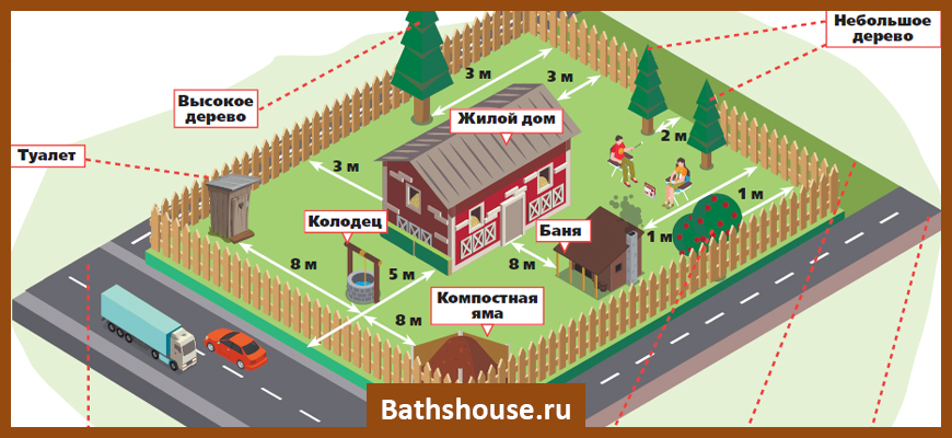 Существуют такие нормы удаленности бани от других объектов: