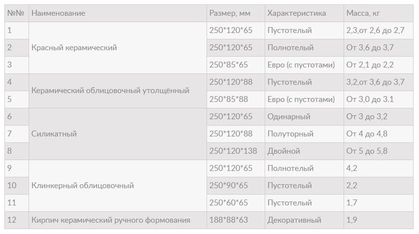 Таблица 1. Вес (масса) красного кирпича одинарного (250×120×65 мм), полуторного (250×120×88 мм), двойного (250×120×138 мм) и евро (250×85×65 мм) форматов:
