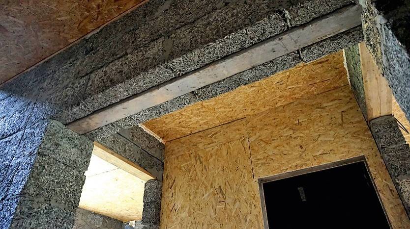 Перемычки над проёмами правильнее всего выполнить с помощью специальных блоков U-образного сечения. В эти лотки укладывают арматурный каркас и заливают цементно-песчаный раствор или тяжёлый бетон. Перекрывать проёмы можно также самодельными ж/б балками и отрезками арматуры и металлопроката, но, если вы планируете штукатурить стены, использовать голый металл нежелательно, так как со временем на отделке почти наверняка проступит ржавчина.