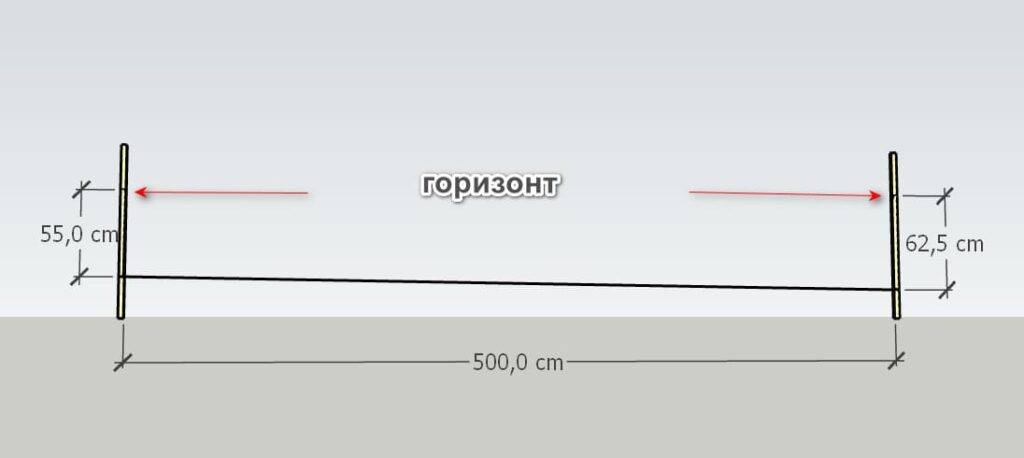 Замеряем рулеткой расстояние между этими двумя метками на стойке, прибавляем к результату 2 см умноженные на метраж дорожки, и откладываем этот размер от верхней метки на второй стойке.